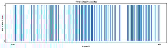For the saccade analysis, SPEED allows users to visualise the mean and maximum velocity of saccades (Figure 5) and the amplitude time series (Figure 6), providing insights into the characteristics of eye movement. Blink events are also visualised as discrete time series, where a value of 1 represents a blink, as shown in Figure 7, offering an overview of blinks during tasks; this process is further enriched by Algorithm A10 to determine if blinks occur within or outside the ROI.