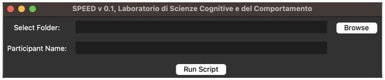 The interface is designed to be extremely simple. It allows the loading of two pieces of information: (1) the folder in which the files downloaded by the Pupil Cloud are present and (2) the name (or code) to assign to the participant. In Figure 10, the interface of the first alpha version of SPEED is shown. In the selected folder, all files need to be loaded.