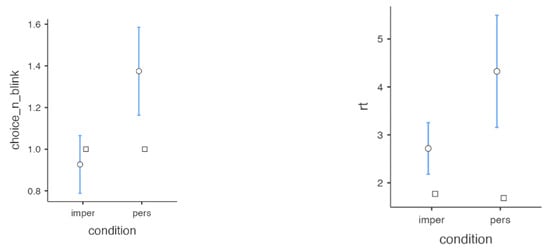 Results of the MDMT experimental paradigm for decision-making. The variable “choice_n_blink” represents the number of blinks computed using an adapted version of SPEED for the two conditions ‘ìmpersonal” and “personal”, and “rt” indicates the reaction time. The circle represents the mean and the square represents the median. In blue, the range of the values is shown.