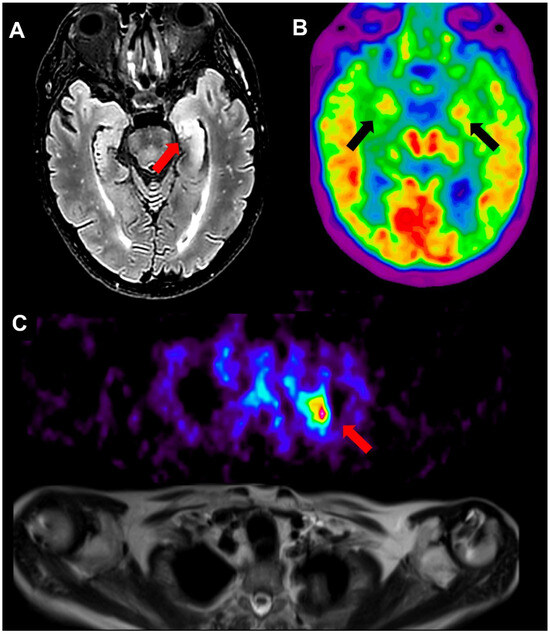 - Sadaghiani, M.S.; Roman, S.; Diaz-Arias, L.A.; Habis, R.; Venkatesan, A.; Probasco, J.C.; Solnes, L.B. Comparison of Quantitative FDG-PET and MRI in Anti-LGI1 Autoimmune Encephalitis. Neuroradiology 2023, 65, 1225–1238. [Google Scholar] [CrossRef]