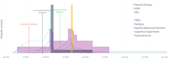 - Chukwuocha, I.; Al-Moyeed, B.; Eigbe, S.; Shukla, S. LGI1 Encephalitis Manifesting as a Delayed Paraneoplastic Response of Squamous Cell Lung Cancer on Remission. Oxf. Med. Case Rep. 2024, 2024, omae171. [Google Scholar] [CrossRef]