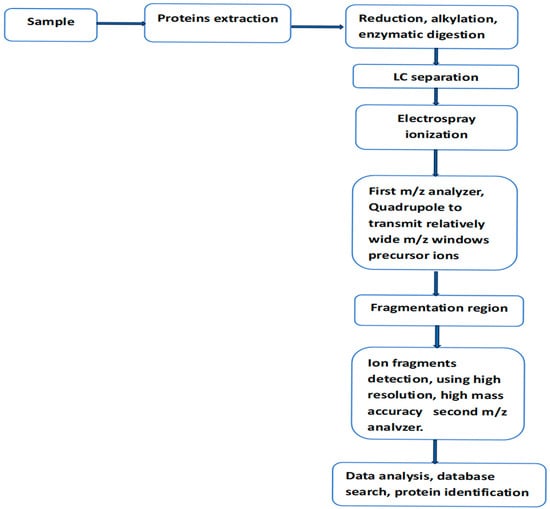 For over thirty years, liquid chromatography coupled with tandem mass spectrometry (LC-MS/MS) has been the workhorse in the analysis of complex protein mixtures present in tissues or biofluids. These analyses can provide specific and accurate information on protein identity, its interaction with other proteins/ligands, and the location and identity of associated post-translational modifications (PTMs). It has to be said that the clinical value of the proteomic data generated by this technique is likely to be more valuable when combined with data sets generated by genetic, epigenetic, and transcriptional methods. The basic components of the experimental setup and the procedure for protein analysis have remained unchanged for over three decades (Figure 1) [,,,]. During the same period, a number of improvements have taken place, including the introduction of high-resolution, high-accuracy mass instruments; more powerful data acquisition modes; and the optimization of sample preparation, including protein labeling, efficient ion fragmentation methods, and more powerful software packages. These developments and their impact on MS-based proteomics have been widely discussed in recent investigations [,,]. Data-independent acquisition (DIA) is one of the more recent developments for MS/MS analysis. This mode of acquisition is known to improve proteins quantification, particularly in complex biological samples, and it reduces the number of ions, which can be missed by other well established acquisition methods [].