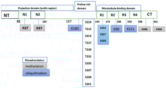 There is clear evidence that protein post-translational modifications (PTMs) alter the charge and hydrophobicity of a protein, in turn inducing structural changes that influence protein function, protein–protein interactions, and protein aggregation []. Practically most proteins, including the “intrinsically disordered” or “natively unfolded” proteins that tend to aggregate in neurodegenerative diseases, are susceptible to PTMs []. Natively unfolded proteins do not have a defined three-dimensional structure, which renders them highly exposed to numerous PTMs. Tau is an example of a natively unfolded protein that can experience various PTMs. Tau is a microtubule-associated protein encoded by the MAPT gene, which is located on chromosome 17q21 and contains 16 exons. The primary structure of tau consists of an N-terminal projection domain, a proline-rich region, a repeat region, and a C-terminal domain [] (Figure 1). Tau has six different isoforms in the human brain that differ from each other in the number of N-terminal inserts [], and the two PTMs, which are known to influence tau aggregation, are considered below.