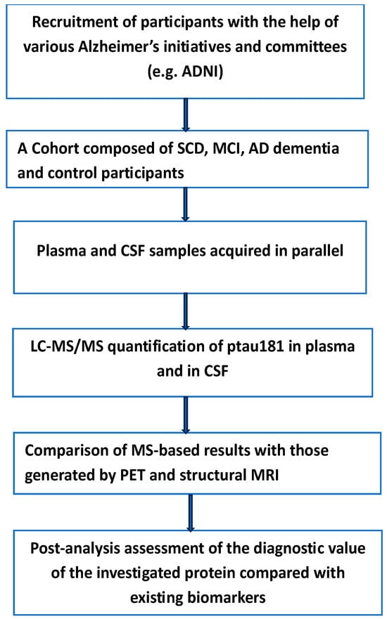 The main steps in the quantitative determination of p-tau181 in both plasma and CSF of participants with various degrees of AD. Subjective cognitive decline (SCD), mild cognitive impairment (MCI). Measurable variation in the level of this protein can reflect the extent of the disease in both testing and validation cohorts. ADNI (Alzheimer’s Disease Neuroimaging Initiative).