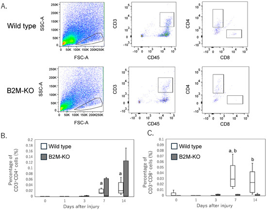 In contrast, the CD3+CD8+ T-cell subset significantly increased at day 7 post-injury in wild-type mice compared with day 0 (p = 0.045), whereas B2M-KO mice exhibited no significant alterations in this subset throughout the observation period (Figure 2A,C). Furthermore, the proportion of CD3+CD8+ T cells was significantly higher in wild-type mithan in B2M-KO mice at day 7 (p = 0.008) and day 14 (p = 0.016) (Figure 2A,C).