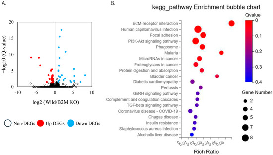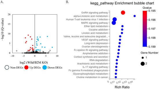 Transcriptomic changes in the sciatic nerve at day 7 post-injury. (A) Volcano plot depicting differentially expressed genes (DEGs) in the sciatic nerve at day 7 post-injury. Light blue dots represent genes significantly downregulated in B2M-KO mice compared to C57BL/6J (wild) mice; red dots indicate genes significantly upregulated in B2M-KO mice; and white dots denote non-differentially expressed genes. (B) KEGG pathway enrichment analysis of genes significantly downregulated in B2M-KO mice at day 7 post-injury.
