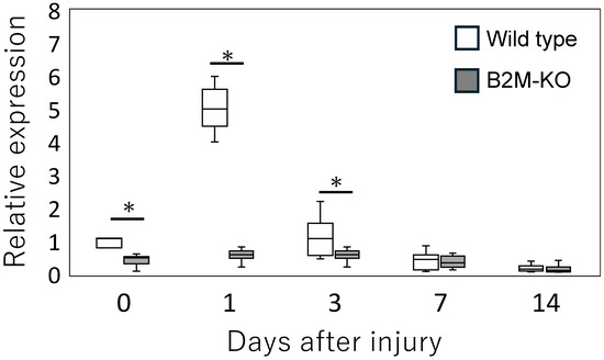 Temporal expression of Thbs1 in the sciatic nerve following injury. Quantitative real-time PCR analysis of Thbs1 mRNA expression in the sciatic nerve of wild-type and B2M-KO mice at days 0, 1, 3, 5, 7, and 14 post-injury. Data are presented as box-and-whisker plots indicating the median, interquartile range, and minimum-to-maximum values. Statistical significance was determined using the Mann–Whitney U test for comparisons between wild-type and B2M-KO mice at each time point. Significant differences between wild-type and B2M-KO mice at the same time point are indicated by asterisks: * p < 0.05.