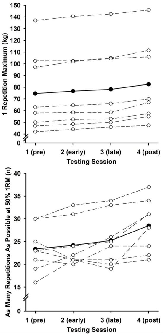 | 1RM (kg) | 74.56 (46.28, 102.85) | 76.63 a (47.83, 105.42) | 78.19 a,b (48.97, 107.40) | 82.56 a,b,c (53.55, 111.57) | 58.24 | *** | 0.89 |