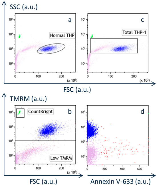 To further characterize these particles, the cell suspension was also incubated with Annexin V-633, which binds to phosphatidylserine (PS) exposed on the outer leaflet of apoptotic cells [17,18]. Annexin V-conjugated fluorophores are widely used for detecting early apoptosis [18]. In Figure 1d, the TMRM fluorescence is plotted against Annexin V-633 fluorescence for particles within the “total THP-1 cell” gate (Figure 1c). Particles stained positively with Annexin V-633 (colored red) were predominantly found within the low TMRM population. This supports the view that mitochondrial dysfunction precedes and contributes to the induction of apoptosis [18].