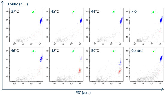 At 24 h after THP-1 cells were exposed to PRF electric fields or to heat, the cells were incubated for 15 min with 10% (vol/vol) culture medium containing tetramethylrhodamine methyl ester (TMRM) and Annexin V-633 at final concentrations of 100 nM and 1% (vol/vol), respectively. A 40 µL aliquot of the cell suspension and a 4 µL aliquot of CountBright absolute counting beads (1 × 106 beads/mL) were transferred to a polystyrene tube, and the volume was adjusted to 400 µL with culture medium supplemented with 2 mM CaCl2. Particles in the suspension were analyzed using a FACS Canto II flow cytometer (Becton Dickinson [BD], Franklin Lakes, NJ, USA), according to previously described methods [5,6].