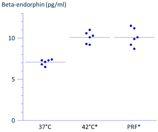 Taken together with our previous findings, the current results indicate that applying 70 V of PRF current for 15 min at just under 43 °C enhances POMC mRNA [5], and increases β-endorphin release in THP-1 cells, without inducing cytotoxic effects [5,6].