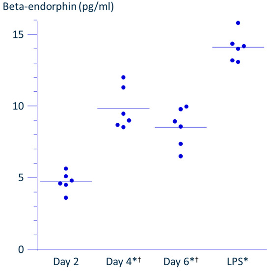 THP-1 cells were incubated in the absence or presence of 100 ng/mL lipopolysaccharide (LPS). Culture supernatants were collected on 1, 2, 4, and 6 days after incubation without LPS, and 48 h after medium replacement on day 4 for the LPS-stimulated cells. Note that the concentration of β-endorphin collected on day 1 was under the detection limit of the ELISA system. The β-endorphin concentration in the supernatant collected on day 2 was 4.7 ± 0.9 pg/mL, on day 4 was 9.1 ± 0.4 pg/mL, and on day 6 was 8.7 ± 1.1 pg/mL. The β-endorphin concentration in the supernatant collected at 48 h after the replacement of culture medium of THP-1 cells stimulated with LPS for 4 days was 14.2 ± 1.0 pg/mL (mean ± SD, n = 6). Six individual data distribution and the mean of each group are presented in the graph. * Significantly different from Day 2 (p < 0.0001). † Significantly different from LPS (p < 0.0001).