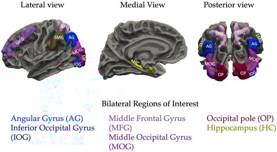 Occipital cortex ROIs included the bilateral middle occipital gyrus (MOG), inferior occipital gyrus (IOG), and the occipital pole (OP), which encompasses the primary visual cortex. Parietal cortex ROIs included the bilateral superior parietal lobule, angular gyrus (AG), and supramarginal gyrus (SMG). The MFG was included due to its established role in decision-making [21,22,23]. Recent primary literature identified cortical thickness (CT) as a valid and sensitive measure of gray matter structure, particularly because it often corresponds with other MRI, genotypic, and phenotypic measures and accounts for cortical folding, unlike total gray matter volume [29,30,31,32,33,34,35]. Figure 1 overviews bilateral regions of interest used in the current study based off fMRI studies.