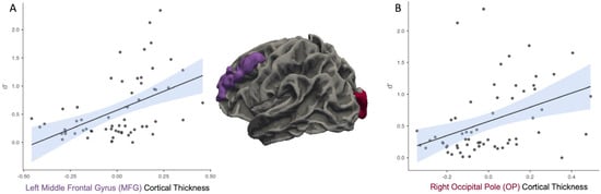 When controlling for eTIV, partial correlational analyses indicated that there was a significant positive relationship between d′ and CT in the left MFG, r = 0.49, p < 0.001 (Figure 3A) and CT in the right OP r = 0.39, p = 0.002 (Figure 3B). Both of these findings were still significant after FDR correction.