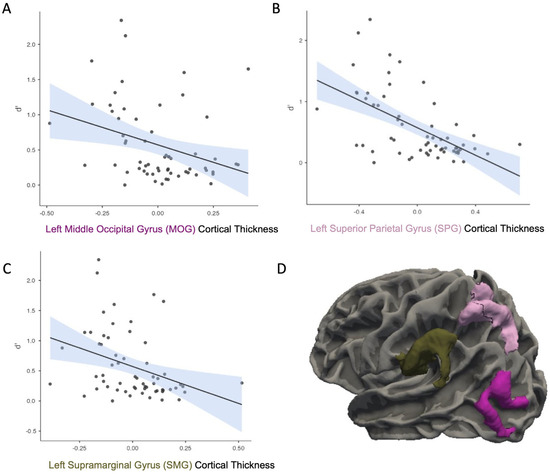 Cortical thickness in the left middle occipital gyrus (MOG; (A)), superior parietal gyrus (SPG; (B)), and supramarginal gyrus (SMG; (C)) was negatively correlated with memory sensitivity (d′). (D) Shows a visualization of the location of these brain regions. For all plots, each black dot represents an individual participant’s data point. The solid line shows the fitted regression line from the model. The shaded area around the line reflects the standard error of the estimate.