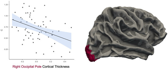 Analysis of the C variable indicated significant correlations with CT in the left AG, r = −0.29, p = 0.025. However, this finding did not survive FDR correction. The right occipital pole analyses indicated a significant negative correlation with C, r = −0.39, p = 0.002 (Figure 5), which survived FDR correction.