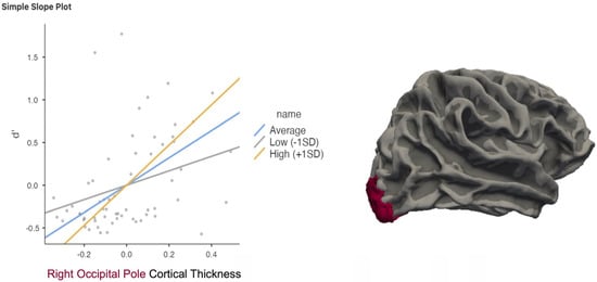 Due to the disparate findings of the right occipital pole, we performed a post hoc moderation analysis to examine whether C moderated the relationship between d′ and CT. We found that C significantly moderated the relationship between CT in the right OP and d′ with p = 0.015 (Figure 6).