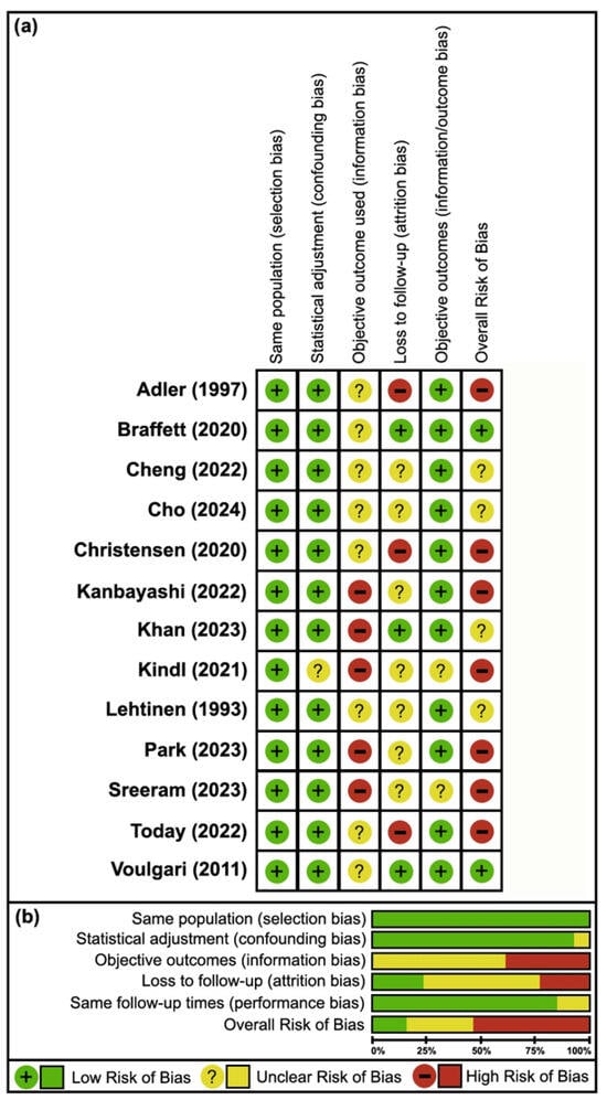 | Current/Former Smoking | 9 | 1734/2957 (58.64%) | 19,303/29,261 (65.97%) | 0.73 (0.68–0.79) | 0.89 (0.86–0.92) | Very serious | Low risk | Low risk | Low risk | Very Low ⨁◯◯◯ | Braffett (2020) [26], Cho (2024) [28], Kindl (2021) [32], Christensen (2020) [29], Park (2023) [34], TODAY (2022) [36], Kanbayashi (2022) [30], Adler (1997) [25], Lehtinen (1993) [33] |