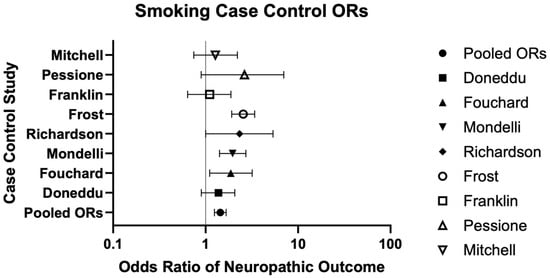 | Richardson (2009) [46] | Case–Control Study | US | Ca: 50; Co: 50 | Ca: 18:32; Co: 34:16 | Ca: 48.4 ± 12.8; Co: 39.2 ± 12 | Ca: With UNE; Co: Without UNE | Smoking: ever, remote (quit >10 yrs), pack-years | Ever smoking and pack-yrs were significantly greater in those with UNE vs. without (25 vs. 15, p = 0.041; 0.29 ± 0.41 vs. 0.13 ± 0.27, p = 0.025). Pack-years were significantly associated with UNE (1.035 [1.001–1.070], p = 0.049). Electrophysiology including CMAP, CV, and conduction block were significantly associated with pack-yrs (p < 0.05). |