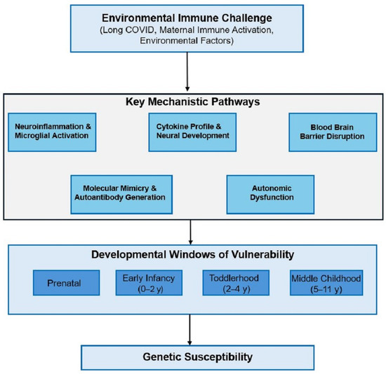 Blood–brain barrier dysfunction provides another critical mechanistic link, as both conditions show evidence of compromised barrier integrity that could allow peripheral inflammatory mediators to directly affect central nervous system development [75,76]. The combination of elevated cytokines with barrier dysfunction could create a feed-forward cycle where peripheral inflammation promotes central nervous system exposure, leading to neuroinflammation that further compromises barrier function. This mechanism could explain the persistence of inflammatory signatures in both conditions despite resolution of acute triggers. Figure 1 illustrates five hypothesized key mechanistic pathways through which environmental immune challenges, including Long COVID, might influence autism expression in genetically susceptible individuals across critical developmental windows.