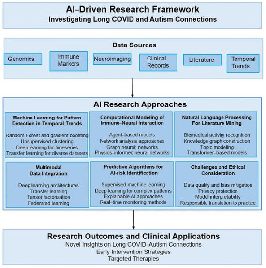 Figure 2 illustrates the comprehensive integrated AI framework that coordinates multiple complementary approaches for investigating potential connections between environmental immune challenges and neurodevelopmental outcomes. This framework illustrates the interconnected workflows of machine learning pattern detection, computational modeling, natural language processing, multimodal data integration, and predictive algorithms, which together address the complexity of Long COVID–autism associations while ensuring interpretability and fostering community engagement.