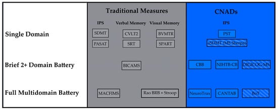 CNADs have been studied for decades [], but their impact has accelerated in recent years. In contrast to traditional person-administered assessments, the computerized platform offers the possibility of self-administration and automated scoring, reducing staff time. A systematic review was published in 2019 by Wojcik et al. []. They found 33 individual tests and 11 test batteries that had been applied in PwMS. Strong psychometric properties were found for the following: the Cognitive Drug Research (CDR) battery [], Cogstate Brief Battery (CBB) [], NeuroTrax [], Central Nervous System-Vital Signs (CNSVS) [], Computerized Symbol Digit Modalities Test (c-SDMT) [], Processing Speed Test (PST) [], and Computerized Speed Cognitive Test (CSCT) [].