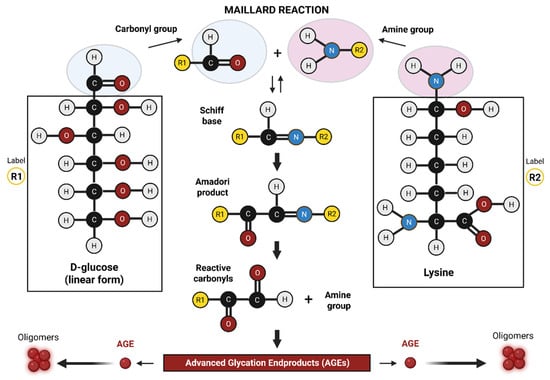The initial step is the formation of a Schiff base between a carbonyl group of the reducing sugar and a free amino group of the protein. This step is reversible if conditions change (e.g., cooling or pH shift). If conditions persist, the Schiff base rearranges into a more stable intermediate known as an Amadori product. The formation of Amadori product involves the rearrangement of covalent bonds. This step is irreversible and ultimately leads to formation of AGEs. Importantly, Maillard reaction intermediates, such as the Amadori compound and the dicarbonyl species, also have the potential to react with lipids, further expanding the diversity and complexity of AGE structures.