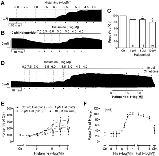 - The histamine concentration–response curve (10−8–10−4 M), followed by the haloperidol concentration–response curve (1–10 µM), followed by 10 µM cimetidine.