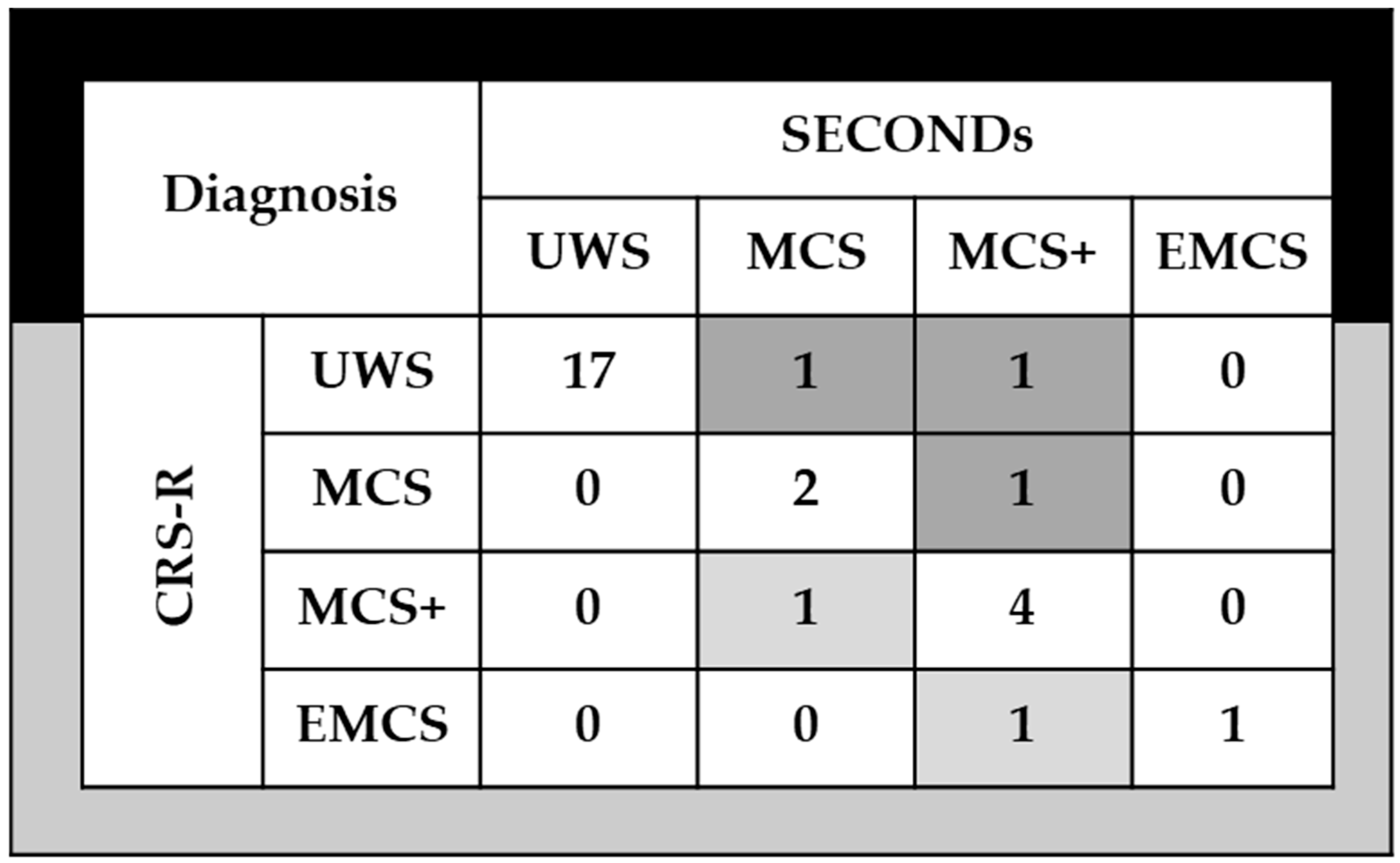 CRS-R | Auditory ≦ 2 AND Visual ≦ 1 AND Motor ≦ 2 AND Oromotor/Verbal ≦ 2 AND Communication = 0 AND Arousal ≦ 2 | Auditory = 3–4 OR Visual = 2–5 OR Motor = 3–5 OR Oromotor/Verbal = 3 OR Communication = 1 | Motor = 6 Communication = 2 |