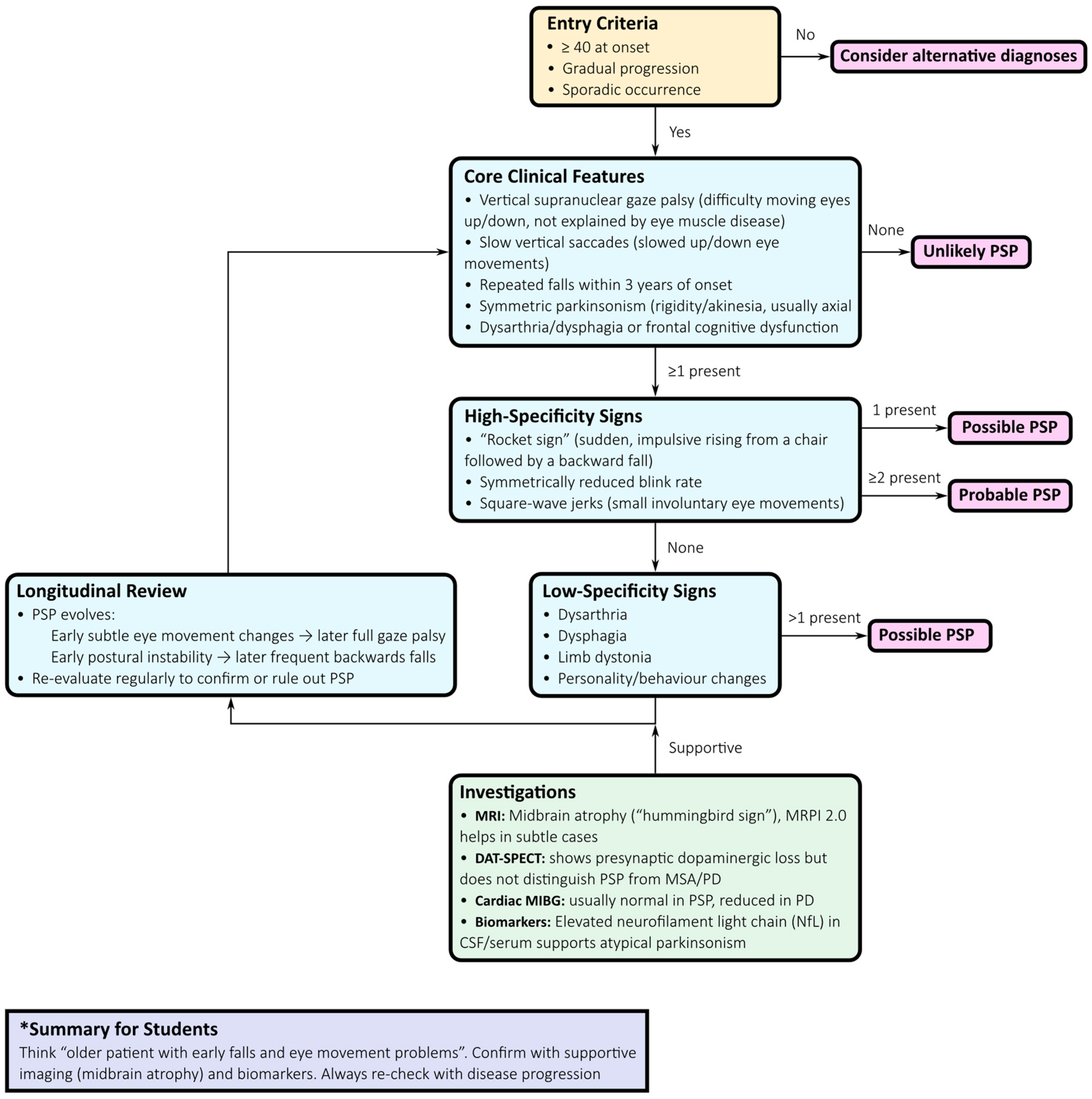 - Phenotypic classification: The MDS criteria support early recognition of variant phenotypes, including PSP-P, PSP with predominant gait freezing (PSP-PGF), PSP–corticobasal syndrome (PSP-CBS), PSP–frontotemporal dementia (PSP-FTD), and language-predominant variants.