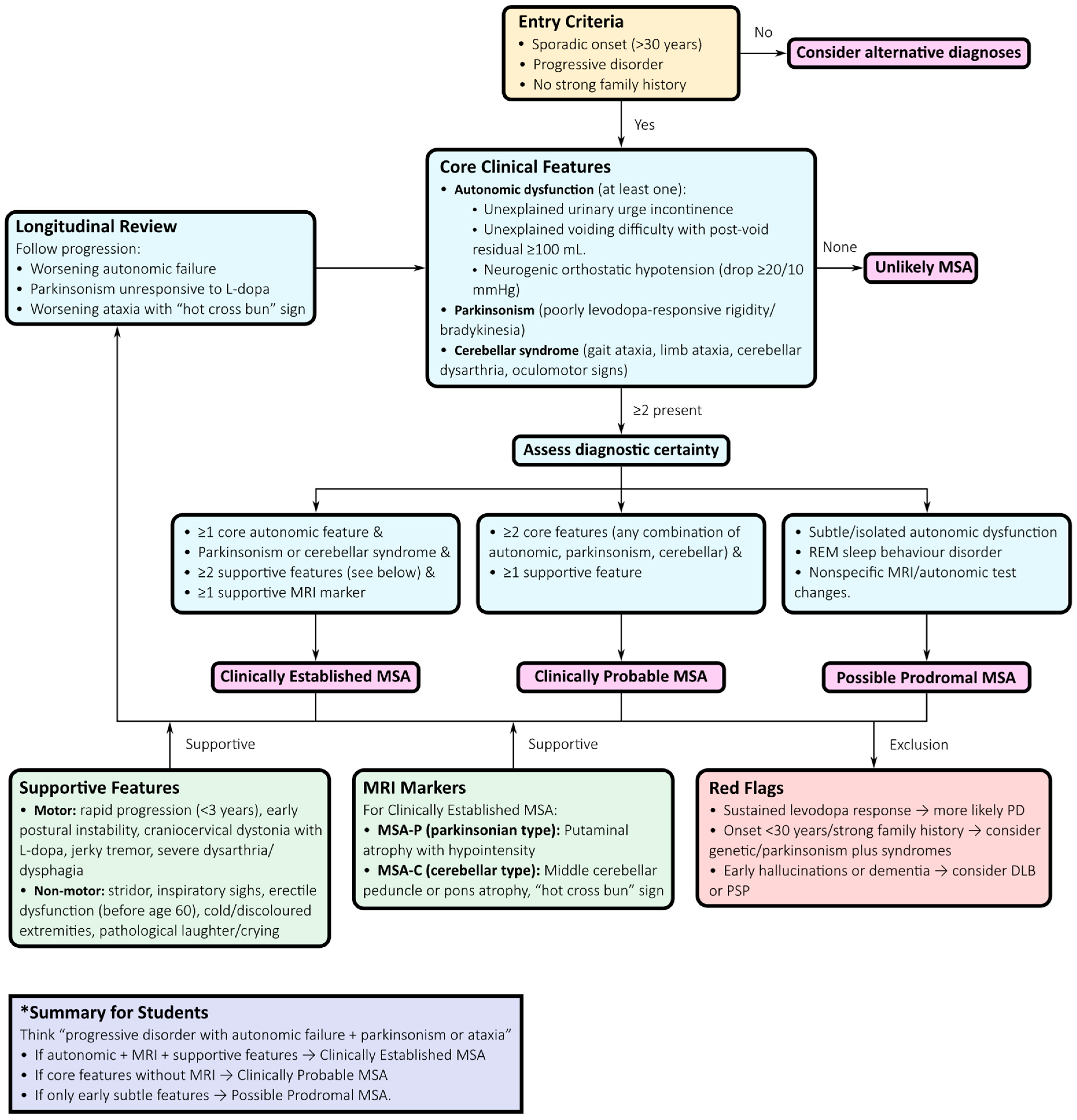 - Initial presentation: Suspect MSA when symmetric Parkinsonism (MSA-P) or cerebellar ataxia (MSA-C) occurs alongside autonomic failure. Autonomic symptoms frequently precede motor signs and should trigger early diagnostic consideration.