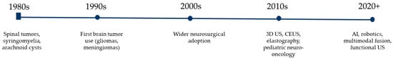 Evolution and applications of iOUS in neurosurgery. Timeline illustrating the progressive adoption of IOUS from its introduction in the 1980s for intramedullary lesions and CSF pathologies, to contemporary applications in brain and spine oncology and degenerative and traumatic conditions and the integration of advanced modalities such as 3D navigation, CEUS, elastography, AI and robotics.