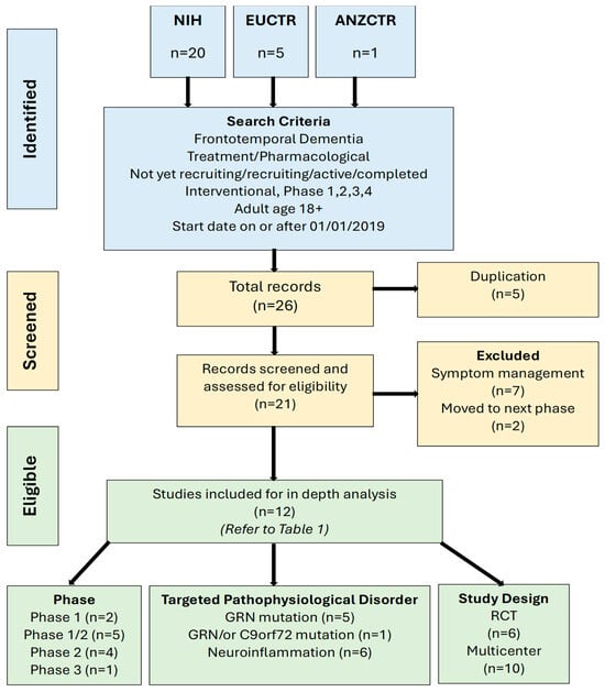 A search of current (active) or recently completed interventional studies for disease-modifying treatments of FTD was completed using three primary portal registries of the World Health Organization International Clinical Trials Registry Platform (ICTRP). The search was performed by the lead investigator (P.B). The registries searched included the following: the United States of America’s (USA) National Library of Medicine (NIH) Clinical Trials Registry, which incorporates trials from over 200 countries worldwide and is available at https://clinicaltrials.gov/; the European Union (EU) Clinical Trials Registry (EUCTR), available at https://www.clinicaltrialsregister.eu/; and the Australian New Zealand Clinical Trials Registry (ANZCTR), available at https://www.anzctr.org.au/.