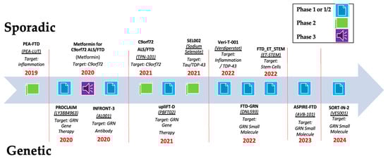 Autosomal-dominant inheritance is found in up to fifty percent of people with FTD [4]. Disease-associated mutation has been identified in three main genetic groups, comprising progranulin (GRN) on chromosome 17q21, C9orf72 on chromosome 9 open reading frame 72, and microtubule-associated protein tau (MAPT) [9,10]. The C9orf72 hexanucleotide repeat expansion represents a crucial genetic link between FTD and amyotrophic lateral sclerosis (ALS), two disorders now recognized as part of a clinico-pathological spectrum [11]. Individuals carrying C9orf72 mutations may present with either isolated FTD, ALS, or a mixed ALS–FTD phenotype, reflecting shared molecular mechanisms of neurodegeneration such as TDP-43 proteinopathy [11]. In clinical trials that include patients with both ALS and FTD, recruitment criteria typically depend on the presence of a confirmed pathogenic testing and or diagnostic features of FTD or ALS. Endpoints may differ slightly between groups, with motor function outcomes often prioritized in ALS cohorts and cognitive and behavioral measures emphasized for FTD participants, although shared biomarkers, such as neurofilament light chain (NfL) levels or imaging markers, are increasingly being used to assess treatment response across both conditions [12,13].