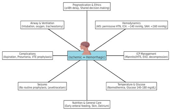 Key domains of ICU management in stroke, including airway and ventilation, hemodynamic targets (maintaining systolic BP ≤ 220/120 mmHg in untreated AIS, ≤185/110 mmHg before and ≤180/105 mmHg after thrombolysis, and ≈140 mmHg in ICH; ICP < 20–22 mmHg with CPP > 60 mmHg), intracranial pressure (ICP) control, temperature and glucose management, seizure treatment, prevention of complications, nutritional support and prognostic/ethical considerations. Abbreviations: AIS—acute ischemic stroke; ICH—intracerebral hemorrhage; SAH—subarachnoid hemorrhage; HTS—hypertonic saline; EVD—external ventricular drain; ICP—intracranial pressure; VTE—venous thromboembolism; HTN—hypertension.