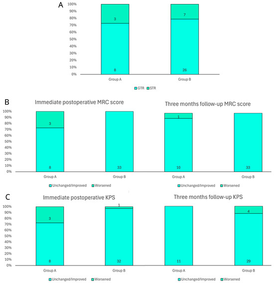 Bar charts of main surgical and clinical outcomes in both groups. (A) Extent of resection according to early postoperative MRI evaluation. (B) Immediate postoperative and three-month motricity status according to MRC score. (C) Immediate postoperative and three-month patient autonomy according to KPS.