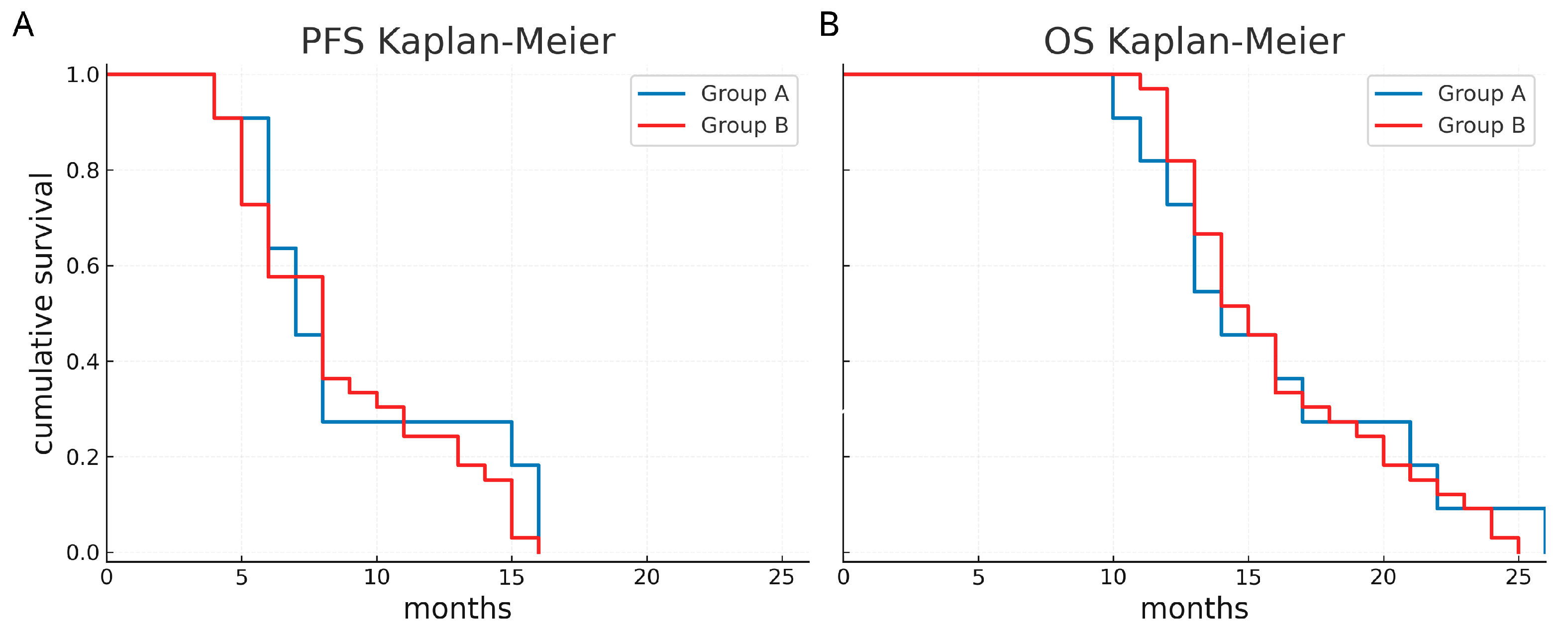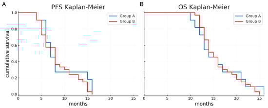 The median PFS was 7 months (95% CI 5.4–8.6 months) in group A and 8 months (95% CI 6.4–9.5 months) in group B. The median OS was 14 months (95% CI 10.8–17.2 months) in group A and 15 months in group B (95% CI 13.5–16.5 months). In addition, the 1-year PFS was 27.3% in group A and 24.2% in group B, while the 1-year OS was 72.7% in group A and 81.8% in group B. Kaplan–Meier survival functions did not show a significant difference (p = 0.441 and p = 0.812, respectively) (Figure 4).