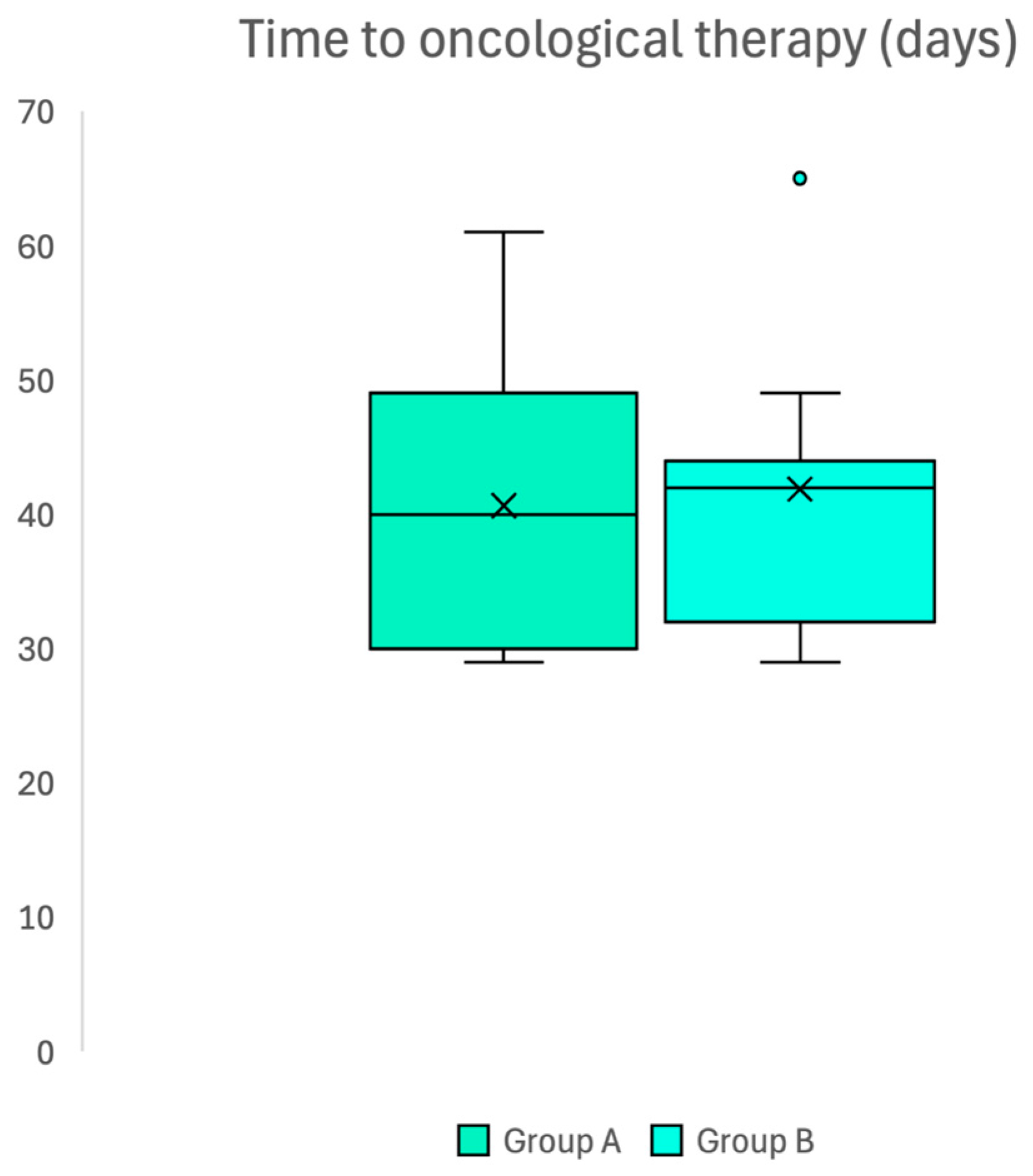 The mean waiting time for the start of oncologic therapy after surgery was 40.6 ± 11.1 days in group A and 41.9 ± 9.4 days in group B (p = 0.719), thus confirming the absence of differences between groups (Figure 3).