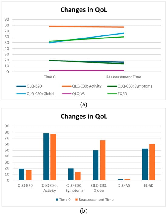 (a,b) QoL on Sillbrain: changes in questionnaire scores between baseline and QoL reassessment.