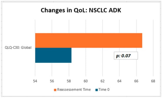 Although not statistically significant, the patients in our cohort showed a median improvement in symptom-related QLQ (part II: from 19.44 to 13.86) and overall QoL (part III: from 50 to 66.67), with no deterioration in QLQ-C30 activity (part I: from 78.12 to 77.08) despite disease progression (Table 2). Interestingly, in the subgroup of ADK patients, QoL scores tended to improve (from 58.3 to 66.7), with a nearly significant trend (p = 0.07, Figure 3). Considering that the functional scales of the QLQ-C30 range from 0 to 100, this finding may reflect a clinically meaningful improvement in patients’ general condition. From a clinical perspective, these results suggest a potential absence of deterioration in the patients’ overall status, even in the context of disease progression. The median QoL VAS score increased from 52.50 to 60.0; although this change was not statistically significant, the scores did not decrease significantly, suggesting that silibinin support, from a clinical point of view, may help maintain patients’ health and well-being (Table 2).