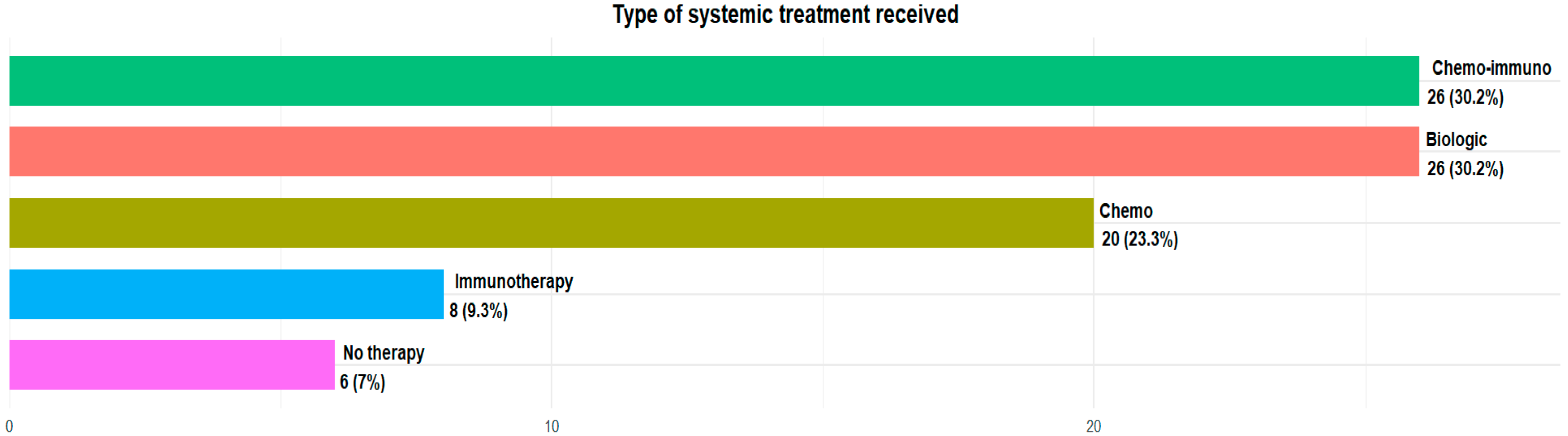 | Chemo-immunotherapy | 26 (30.2) | 20 (27.4) | 6 (46.2) |