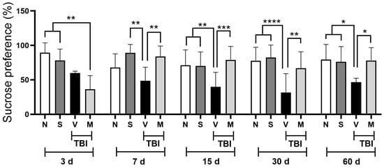 Effect of Mucuna pruriens treatment on the sucrose consumption preference in rats posterior to mild traumatic brain injury. The effect of short-term administration (once a day for five days) of Mucuna pruriens (50 mg/kg, i.p.) on the percentage of sucrose consumed by the different groups of experimental animals is shown. N: naïve rats; S: sham-operated rats; V: rats with mild TBI and administered a vehicle; M: rats with mild TBI and administered Mucunna pruriens extract. All groups were evaluated at 3, 7, 15, 30, and 60 days post-injury. The values are expressed as the mean ± the standard deviation for 12 animals per group. According to a two-way ANOVA, followed by the two-stage linear step-up procedure proposed by Benjamini, Krieger, and Yekutieli, * p < 0.05; ** p < 0.01; *** p < 0.001; and **** p < 0.0001. To ensure the clarity of the graph, only significant differences within the same period of time are shown.