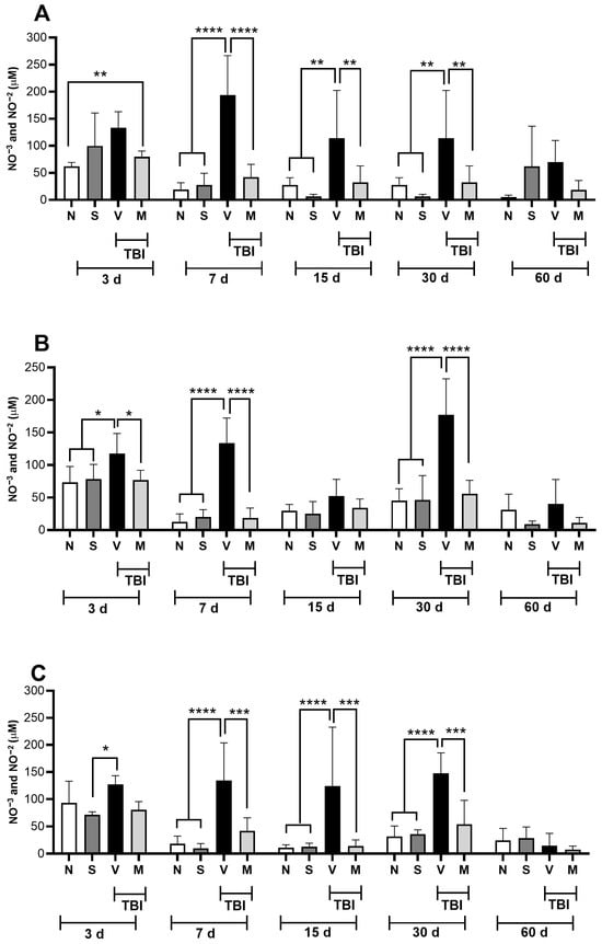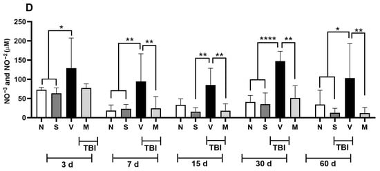In the midbrain (Figure 2C), we observed that mTBI induced a significant increase in the concentration of nitrites and nitrates on days 3, 7, 15, and 30 post-mTBI when compared with those in Groups N and S. We could also see that administering the lyophilized MP extract (M) prevented this significant increase (p < 0.05) from day 7 to 30 after mTBI, in contrast to the results for Group V.