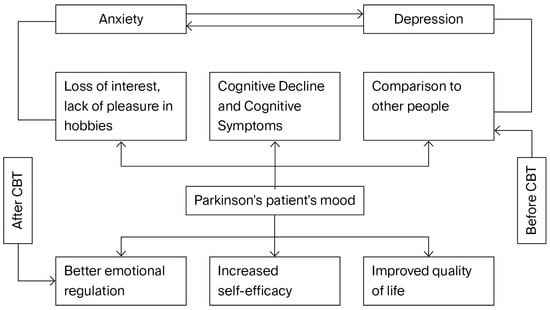 This diagram depicts a conceptual model of how cognitive behavioral therapy (CBT) improves the psychological health and mood of Parkinson’s disease patients. Patients frequently go through a cycle of emotional discomfort, marked by anxiety and sadness, prior to receiving cognitive behavioral therapy. These circumstances contribute to a negative cycle since they are interconnected and encourage one another. The patient becomes more depressed due to this vicious cycle, which is further exacerbated by issues such as cognitive deterioration, a loss of interest or enjoyment in activities, and continually comparing themself to others.