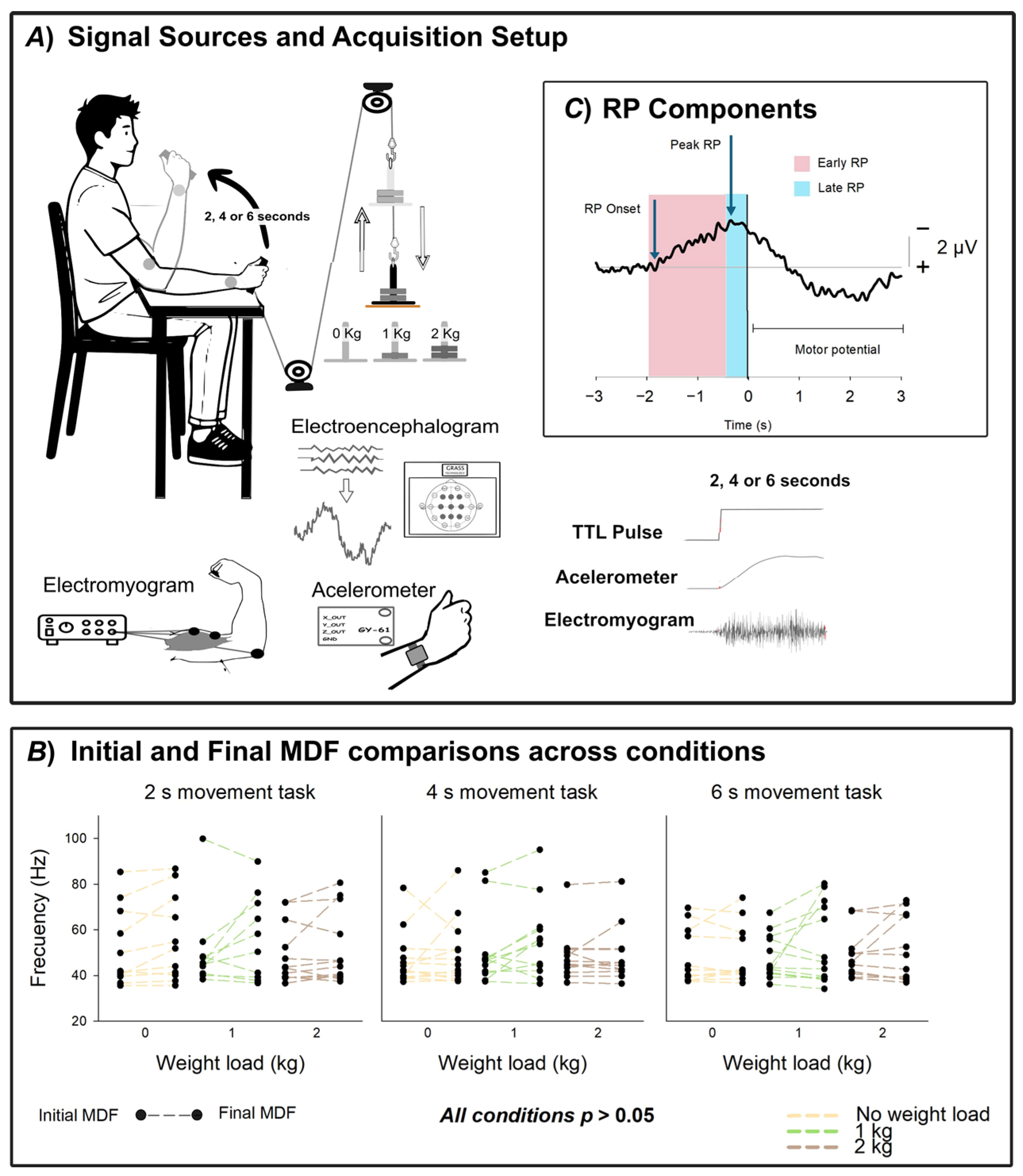 23]. This finding suggests that the RP can serve as a sensitive index of how cortical networks allocate resources when actions require precise timing. Building on this foundation, the present study investigates whether increases in mechanical load affect the preparatory activity linked to voluntary movements, therefore modulating the RP characteristics. Specifically, we examine whether incremental weights, applied in three levels, produce a load-dependent amplification of the RP and how this effect interacts with the duration of the executed movement.