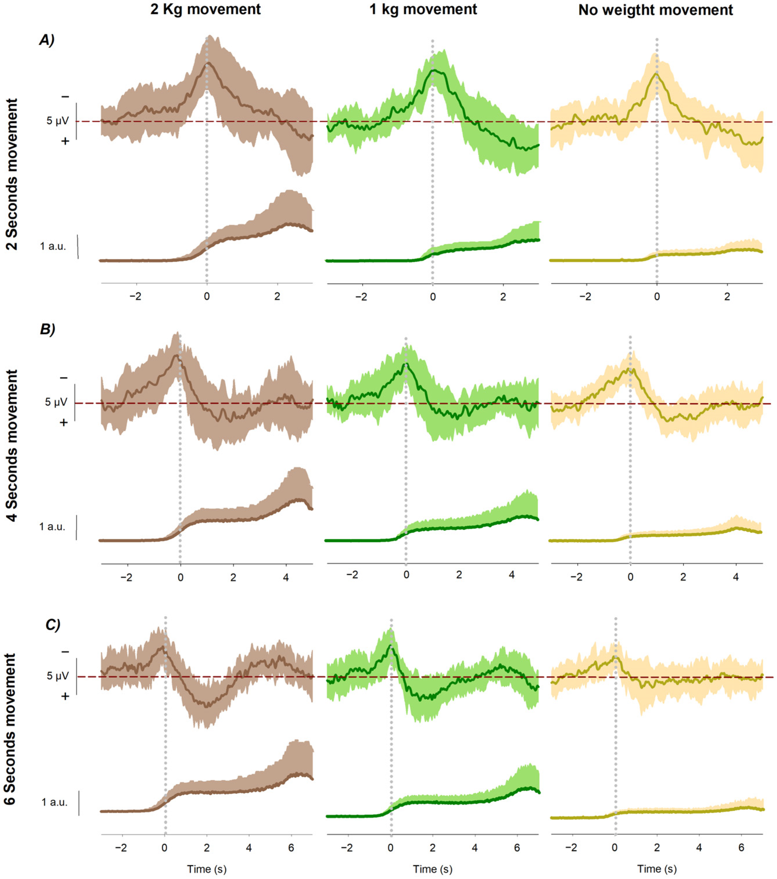 In the comparisons of weight load within the same movement duration, for the 2 s movement, the marginal mean amplitudes were −8.005 ± 0.710 µV (no load), −8.701 ± 0.736 µV (1 kg), and −9.933 ± 0.666 µV (2 kg), with no significant differences. For the 4 s movement, amplitudes were −5.733 ± 0.555 µV (no load), −7.581 ± 0.590 µV (1 kg), and −8.161 ± 0.589 µV (2 kg), with a significant difference between 2 kg and no load (p < 0.01). For the 6 s movement, amplitudes were −4.059 ± 0.584 µV (no load), −5.952 ± 0.510 µV (1 kg), and −6.217 ± 0.564 µV (2 kg), with significant differences between 2 kg and no load (p < 0.05) and between 1 kg and no load (p < 0.05).