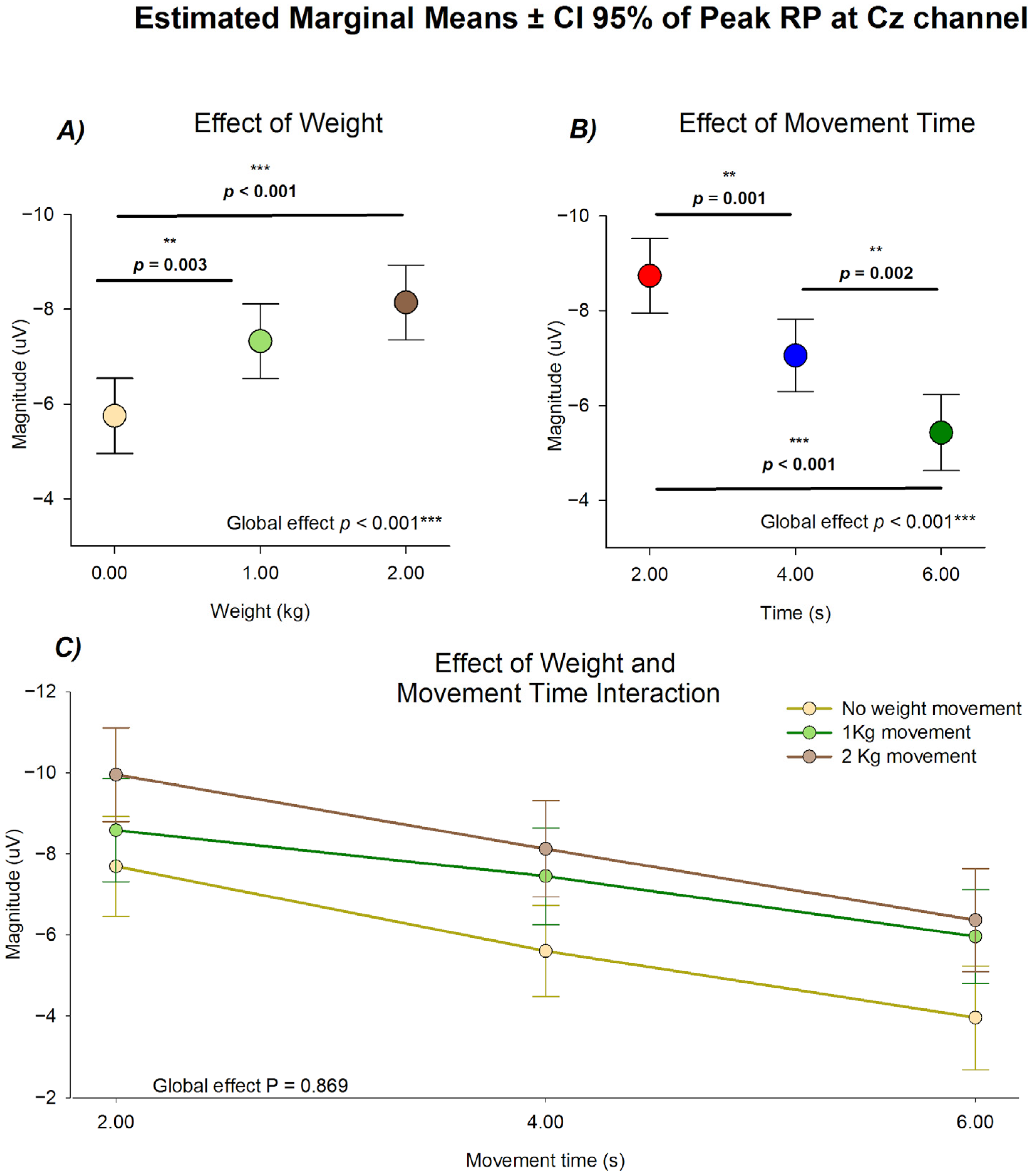 p = 0.869), meaning that the effect of weight load and movement duration in the Peak RP was independent of each other, making the comparison between them possible by adjusting for the effect of the other. This comparison revealed statistically significant effects of movement duration (