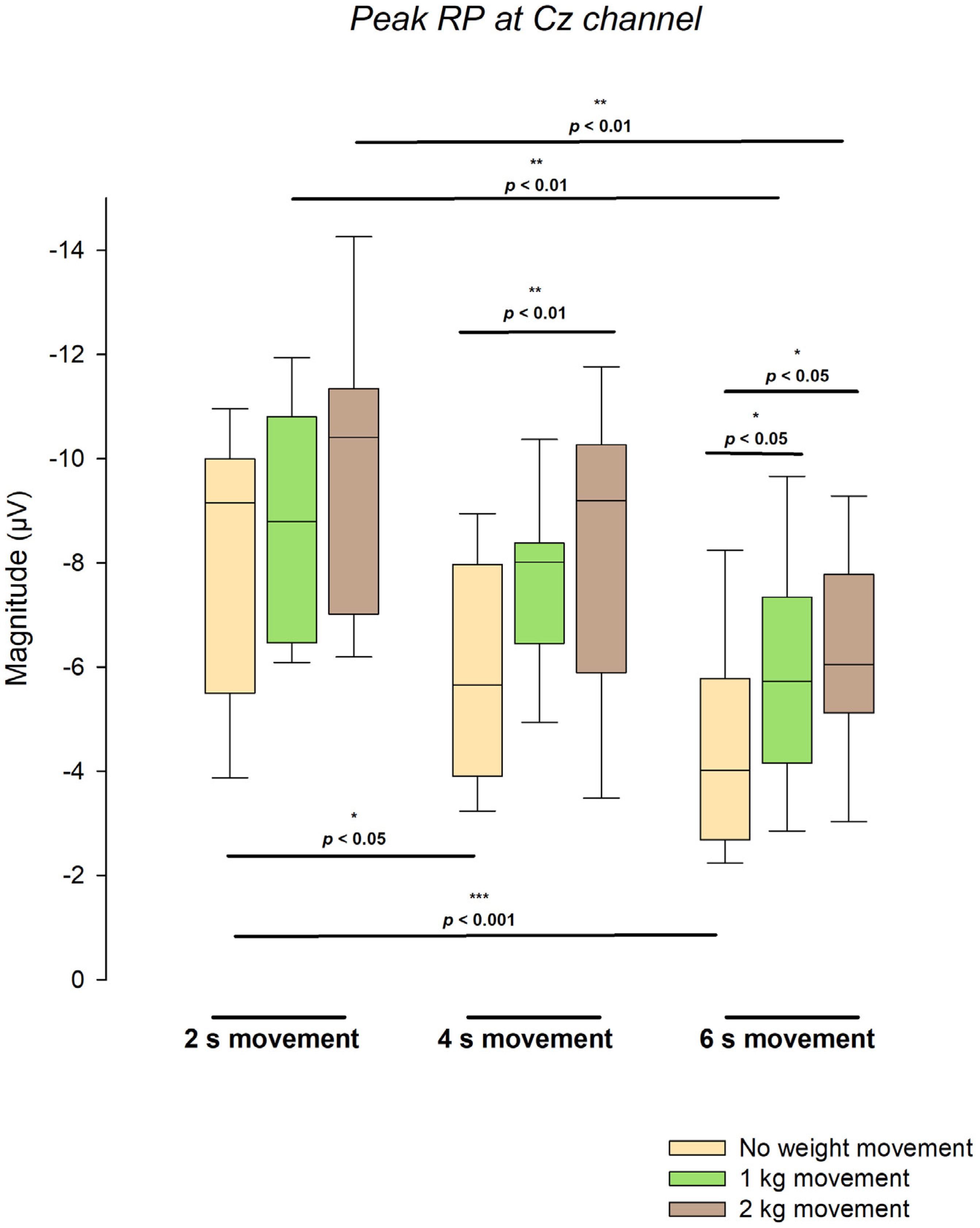 A complementary analysis was performed to reinforce the results by comparing specific combinations of weight load and movement duration as categorical factors: 3 comparisons were made between weight load in the same movement duration category and another 3 between movement duration in the same weight load category. The distribution of peak readiness potential amplitude at Cz exhibited systematic variations across movement durations and load conditions.