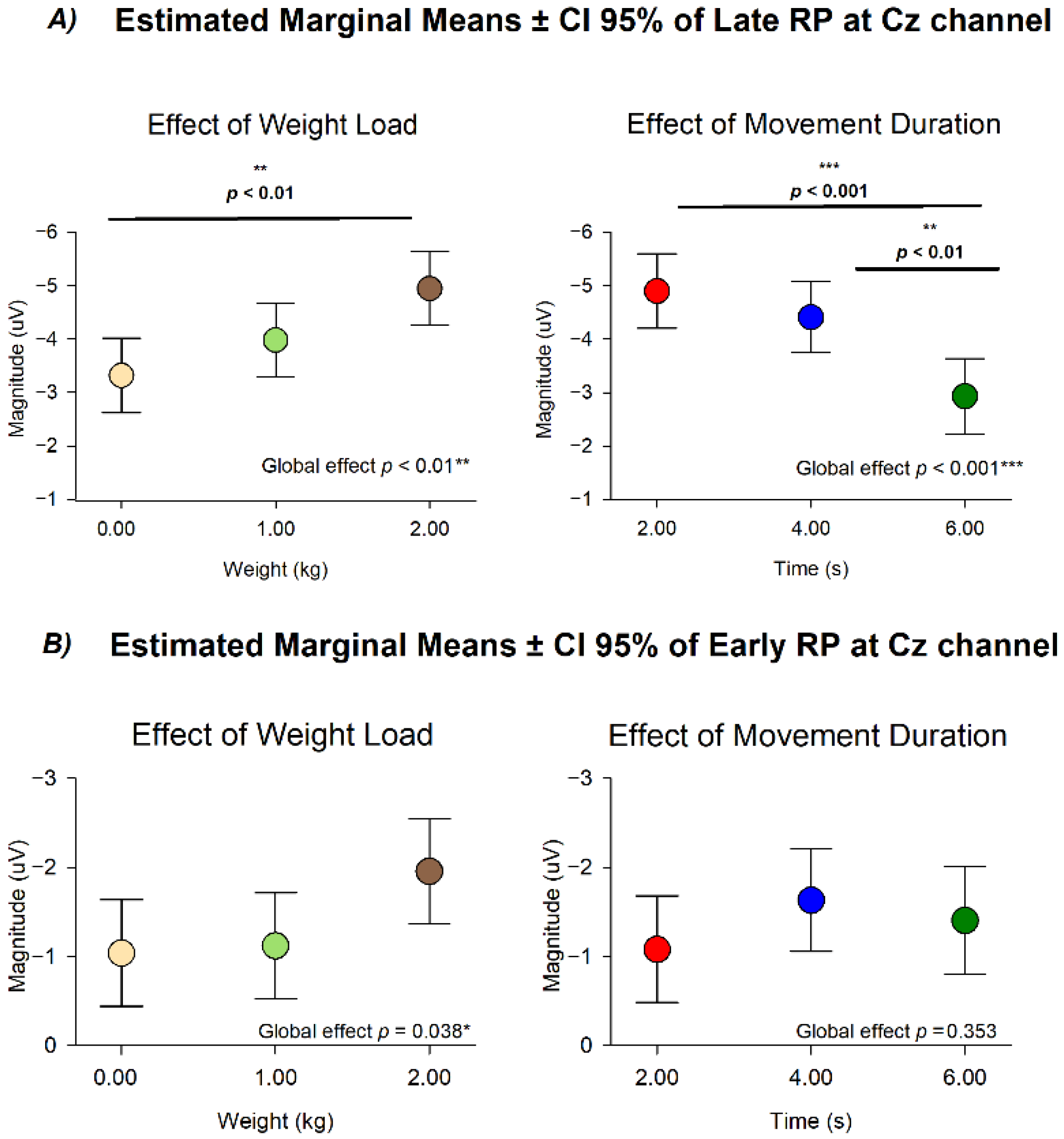 Following the same modulation of the Peak RP, the estimated marginal means for Late RP showed a consistent increase in amplitude as the lifted weight increased (0 kg mean = −3.317 ± 0.349 µV; 1 kg mean = −3.979 ± 0.348 µV; 2 kg mean = −4.945 ± 0.346 µV), and a consistent decrease as the movement duration increased (2 s mean = −4.899 ± 0.409 µV; 4 s mean = −4.409 ± 0.334 µV; 6 s mean = −2.932 ± 0.353 µV). Post hoc comparisons confirmed differences between 0 kg and 2 kg (