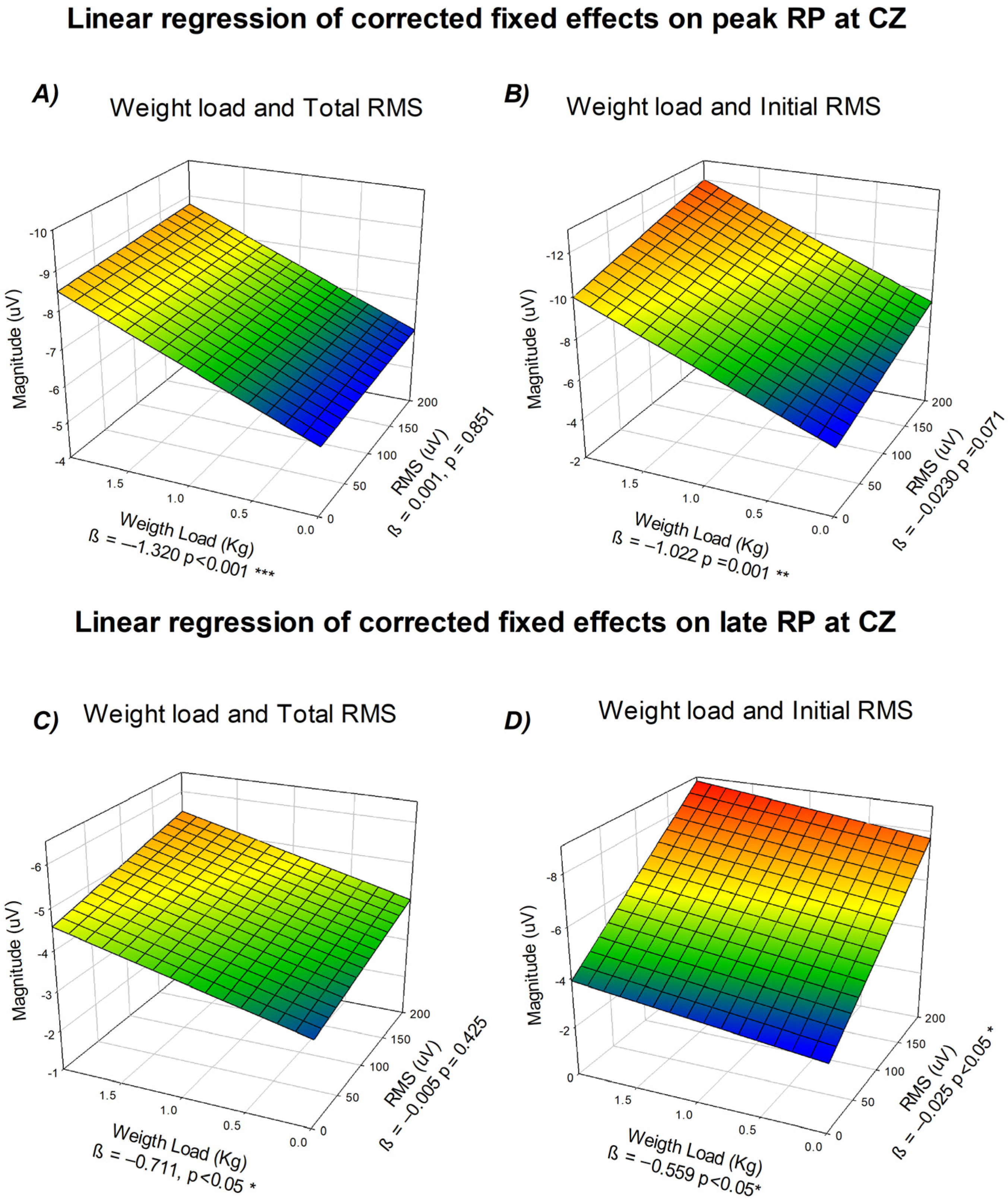 For the late component, a similar relationship was observed. The tridimensional representation (Panel C) shows amplitude as a function of weight lifted and total RMS (weight β = −0.711, p < 0.05; RMS β = −0.005, p = 0.425). In contrast. when iRMS was used (Panel D) both predictors showed significant effects on Late RP (β_weight = −0.559, p < 0.05; β_iRMS = −0.025, p < 0.05). This suggests that late preparatory activity reflects not only planned task demands but also early neuromuscular activation.